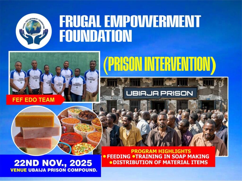 The Frugal Empowerment Foundation (FEF) has successfully concluded another phase of its Prison Inmates Empowerment Project in Edo State, empowering inmates of the State Correctional Centre with practical skills in soap making. The 3 days training which concluded on Saturday, 22nd November, saw 364 inmates learn life skill and marks a significant milestone in FEF’s commitment to rehabilitation and sustainable reintegration of inmates into society.